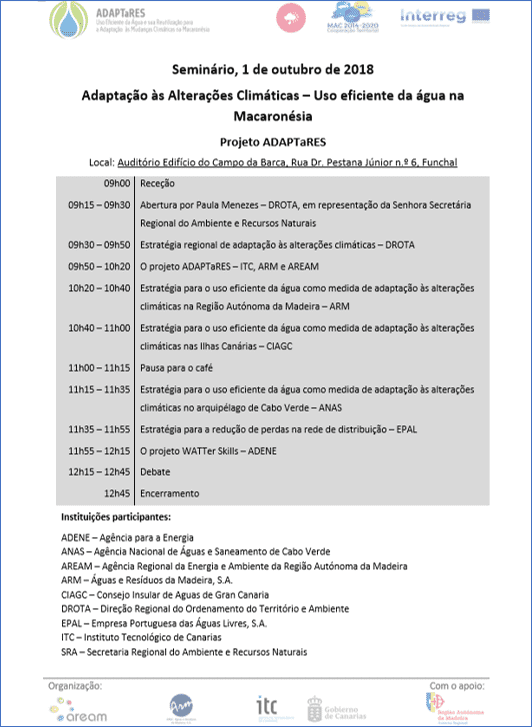 No próximo dia 1 de outubro, Dia Nacional da Água, realiza-se o Seminário “Adaptação às Alterações Climáticas – Uso eficiente da água na Macaronésia”, no auditório do Edifício do Campo da Barca com apresentações de entidades Regionais, Nacionais, de Canárias e Cabo Verde, no âmbito do projeto Interreg MAC “ADAPTaRES – Uso Eficiente da Água e a sua Reutilização para a Adaptação às Alterações Climáticas na Macaronésia”.