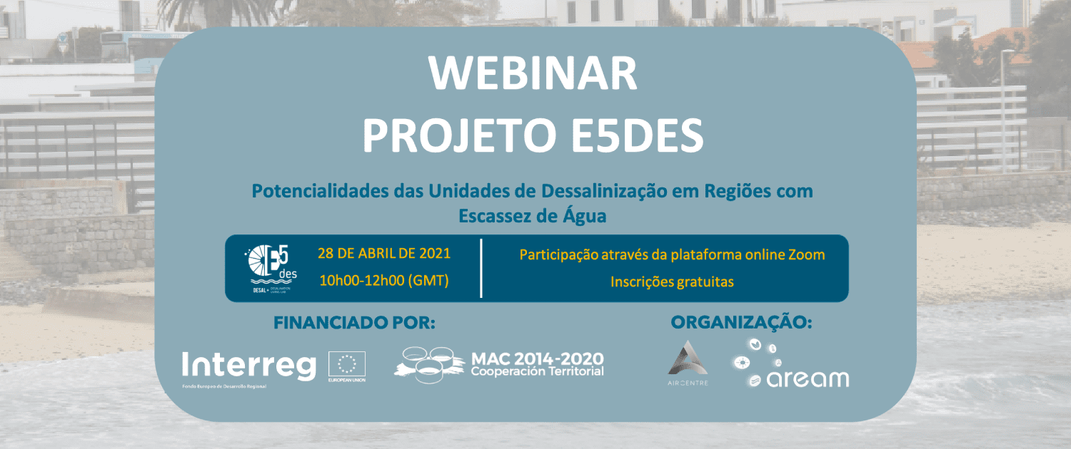 Este webinar online a realizar a 28 de abril pelas 10h (GMT) tem o intuito de promover o projeto E5DES, fazendo uma apresentação do mesmo e dos seus principais desenvolvimentos e resultados até à data. Tendo em conta o cariz deste webinar, a participação é permitida ao público em geral, promovendo-se este webinar junto das entidades regionais e locais responsáveis pela produção e distribuição de água e tratamento de águas residuais. Após a apresentação sobre o projeto, terá lugar uma apresentação sobre a Central Dessalinizadora de Porto Santo, seguida de uma apresentação sobre as necessidades de dessalinização e esforços atuais na região do Algarve e por fim uma apresentação sobre o DESSOL: Sistema de demonstração de dessalinização com energia solar na estação da Ribeira Dom João – Projeto DESAL+. Na fase final do webinar existirá um momento de debate e Q&A.